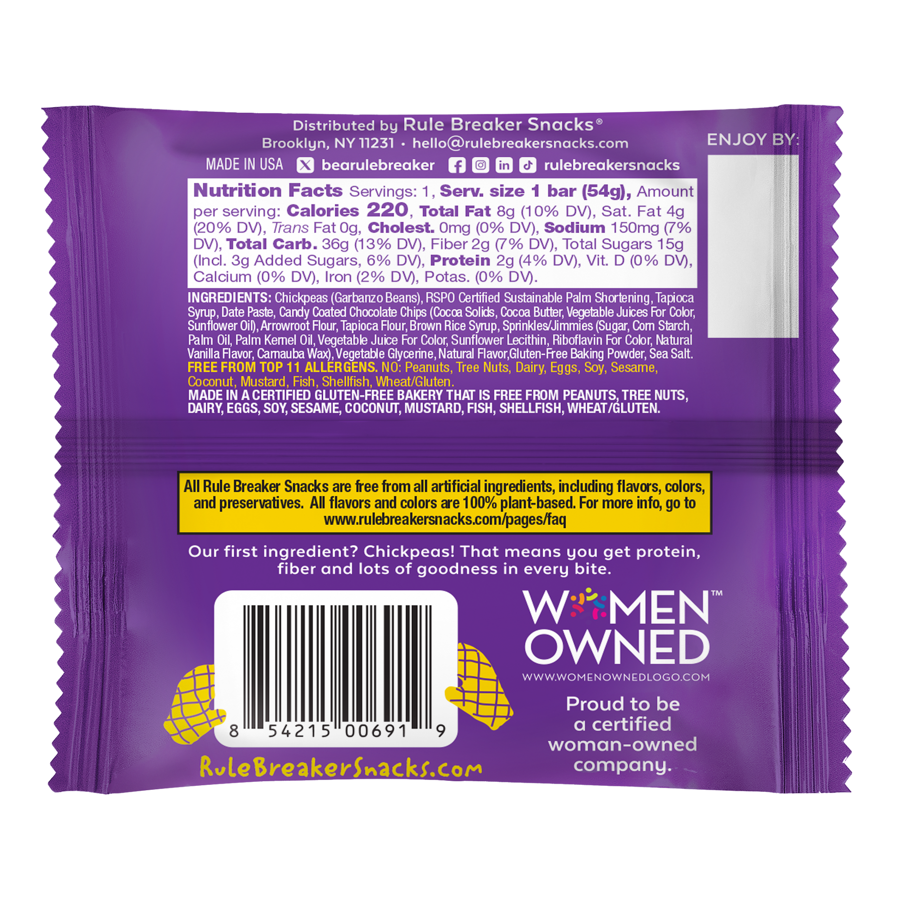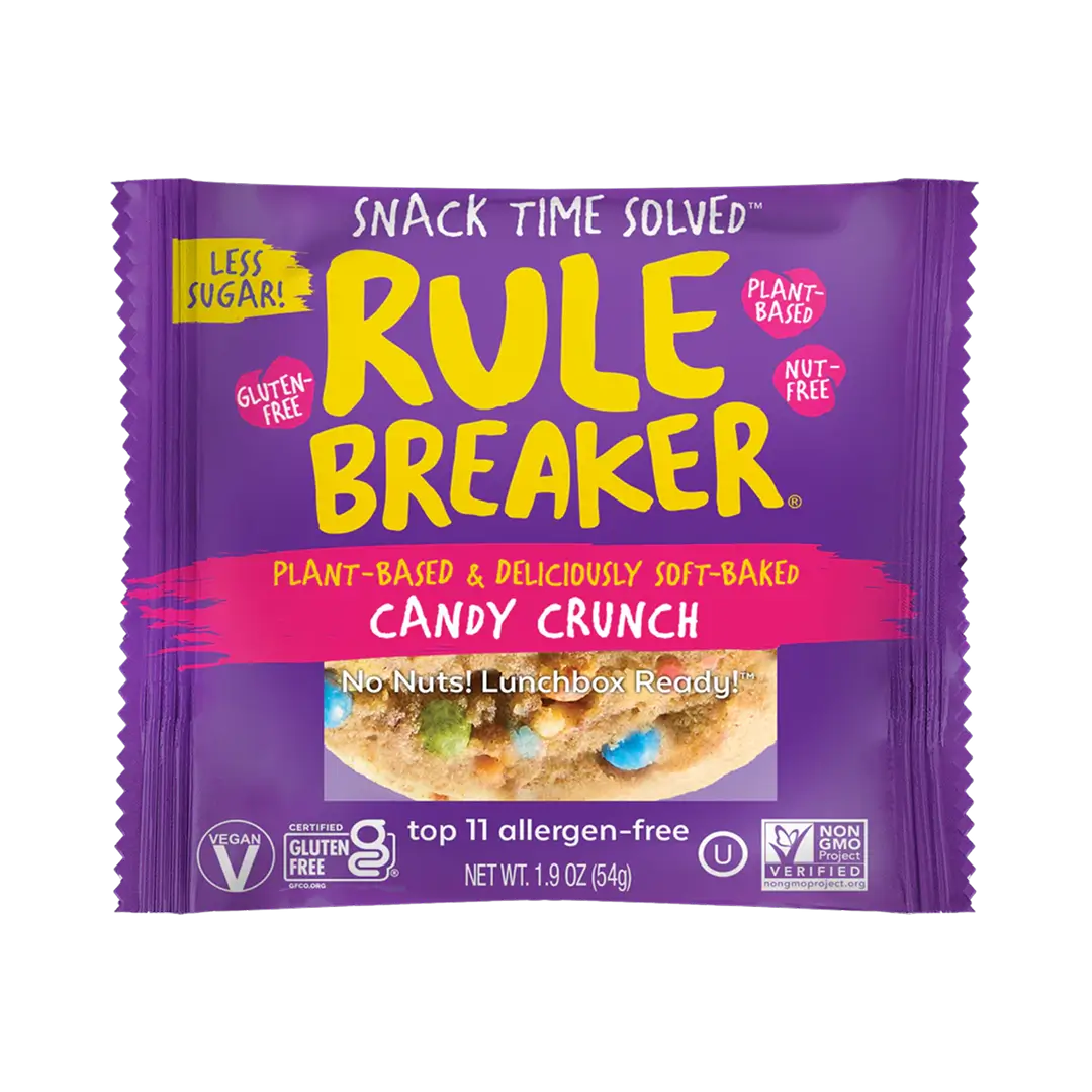 Rule Breaker Snacks Candy Crunch is a soft-baked vanilla cookie packed with colorful, candy-coated chocolate bits— and absolutely irresistible. And you’d never guess chickpeas are the first ingredient (yep… chickpeas!).